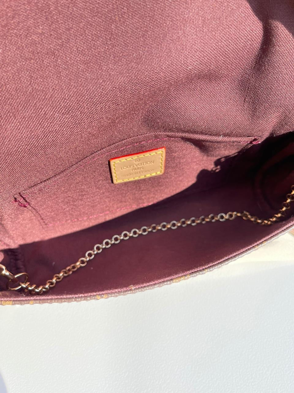 The Victoire chain bag pairs Monogram canvas with smooth colored leather for a sophisticated day-to-evening accessory. The golden clasp is modeled on the lock of classic Louis Vuitton luggage, while the sliding chain strap echoes the Malletage print that lined those historic trunks. Large enough to fit a long wallet, the bag can be worn cross-body or short-shoulder style.