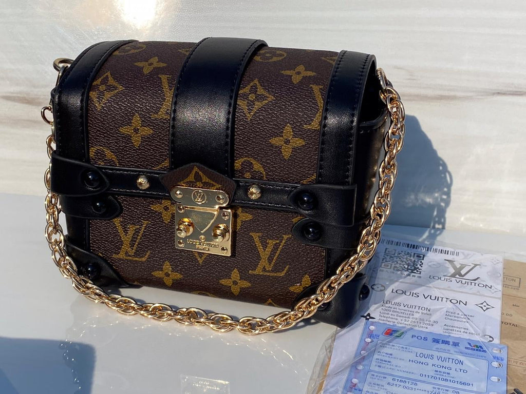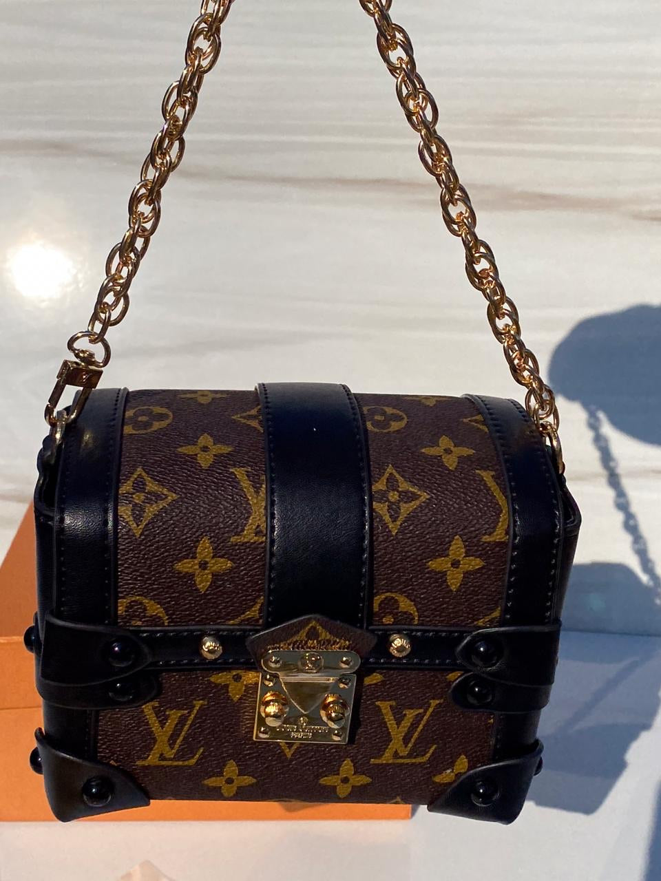 The Victoire chain bag pairs Monogram canvas with smooth colored leather for a sophisticated day-to-evening accessory. The golden clasp is modeled on the lock of classic Louis Vuitton luggage, while the sliding chain strap echoes the Malletage print that lined those historic trunks. Large enough to fit a long wallet, the bag can be worn cross-body or short-shoulder style.