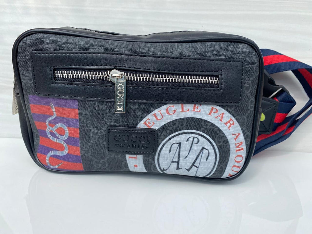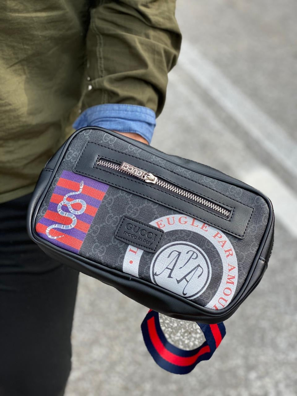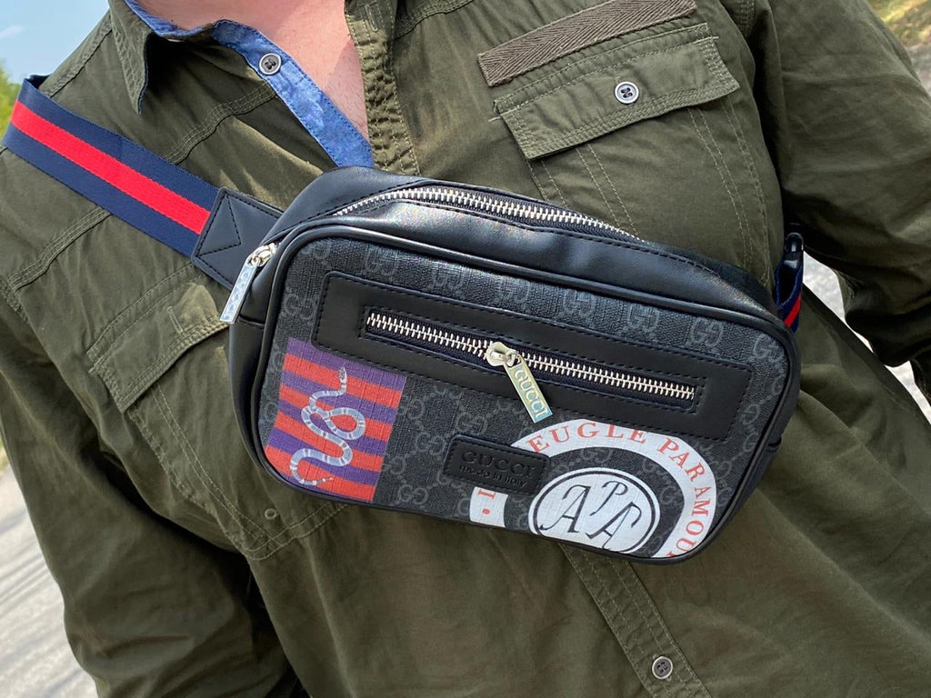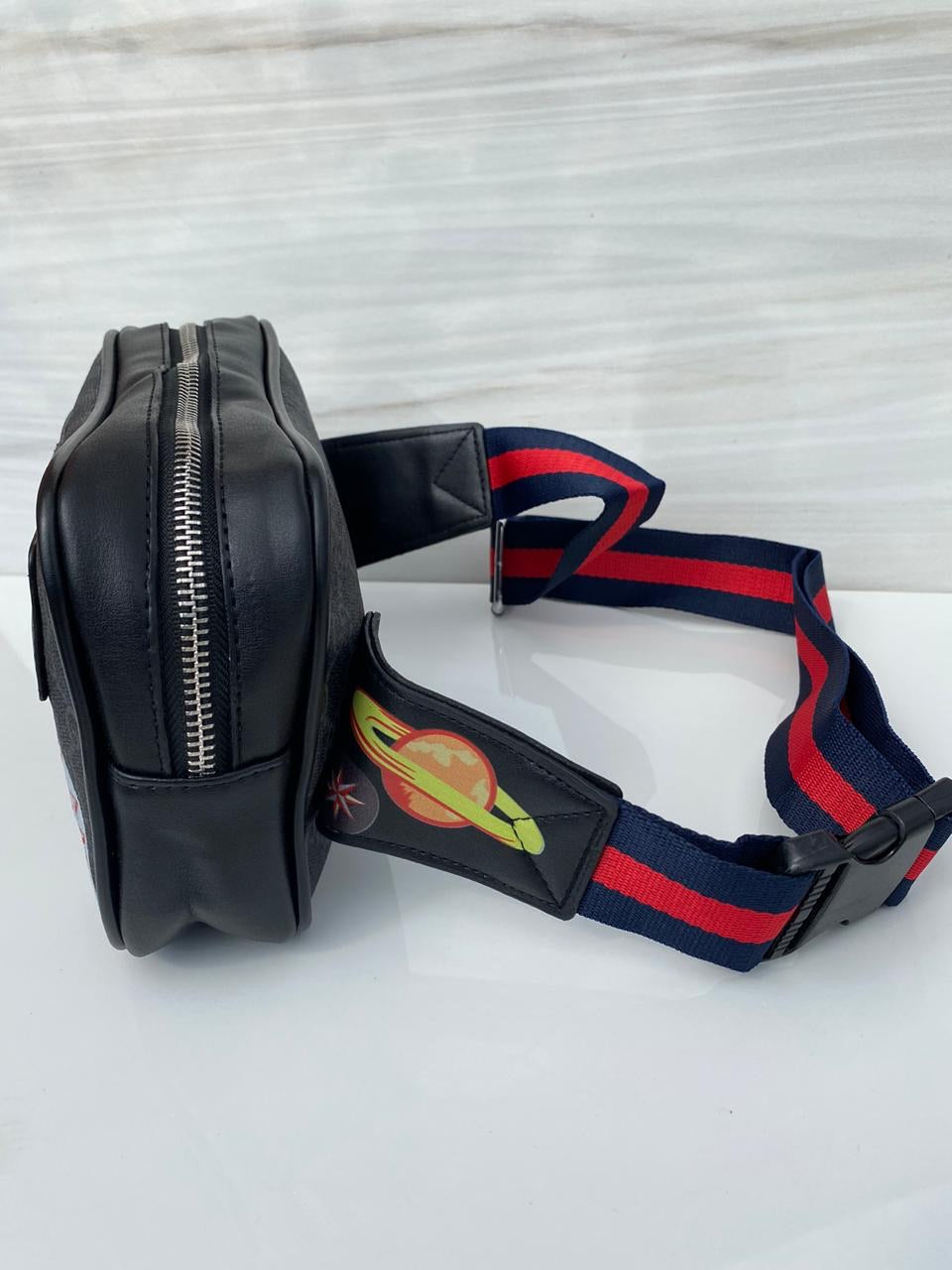 A two-pouch belt bag in GG Supreme canvas with black leather trims. The Web waistband secures with a buckle closure. Beige/ebony GG Supreme canvas, a material with low environmental impact Black leather trims One pouch with snap flap closure One pouch with zipper closure Adjustable green and red Web strap with buckle closure 13"W x 6.5"H x 1.5"D Black nylon lining Made in Italy Can be worn as a belt bag on the hip or waist, or as a cross body bag