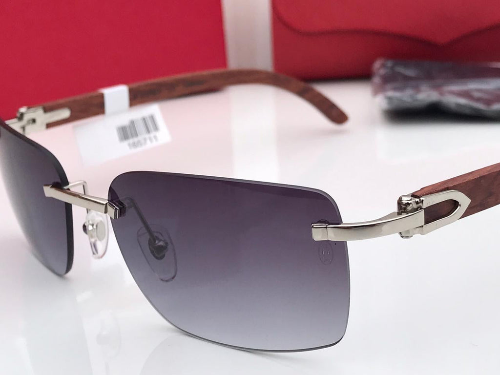 The modest, elegant tone of these EXCLUSIVE models is sealed with a silver-finish Cartier “C” décor on each temple. Wood, horn and composite make up a selection of fine materials crafted in the expert tradition of Cartier eyewear. Rimless sunglasses in bubinga wood with tiger engraving and smooth pale golden finish, rectangular shape, brown lenses with graded golden mirror effect, protection factor
